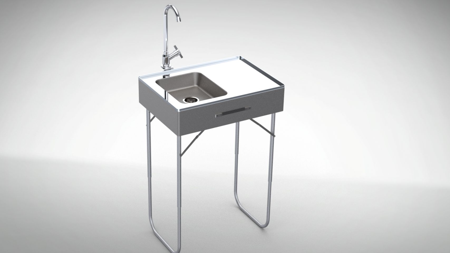 Os pés e a bancada de suporte são retráteis e rebatíveis, tornando a pia extremamente compacta e fácil de transportar.